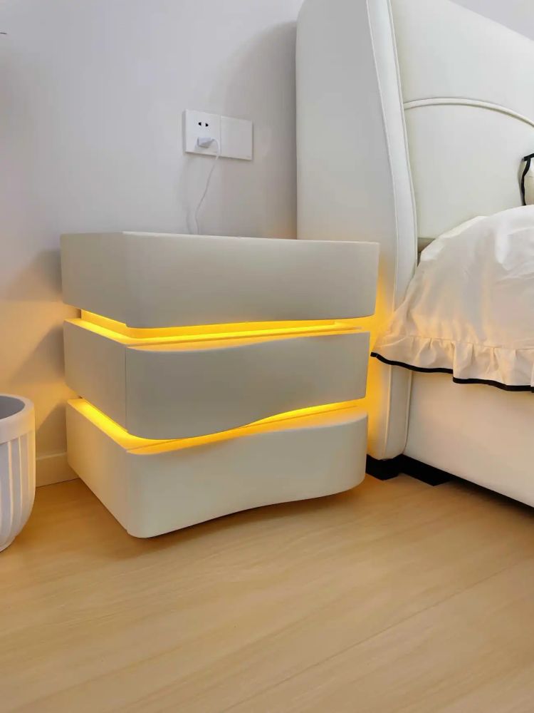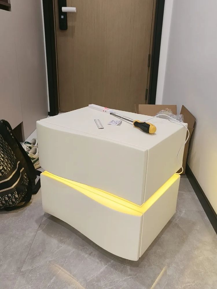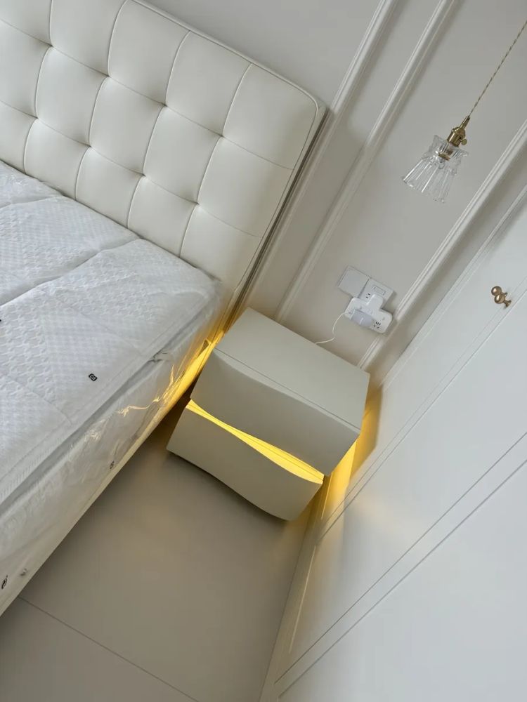 • Cream Style Table, Home Bedside Storage Cabinet, Modern Solid Wood Bedroom, Smart Belt Light