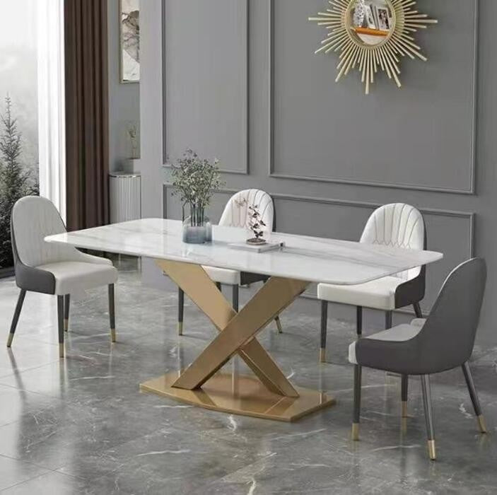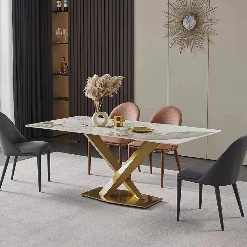 Italian dining table, luxurious, smooth surface, small artificial stone slab. Suitable for condos, stainless steel base, durable, modern.